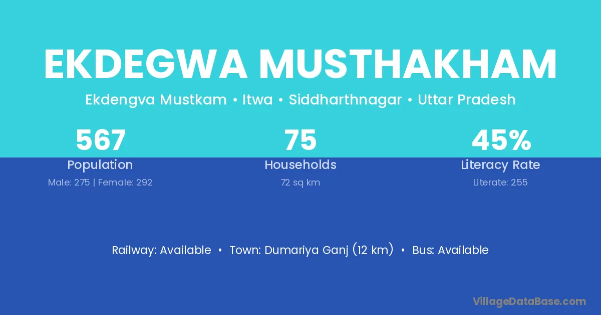 Dumariya Ganj (12 km) is the nearest town to Ekdegwa Musthakham village for major economic activities and is located approximately 12 km away.