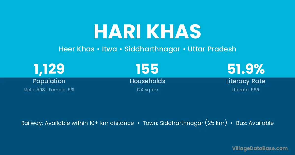Siddharthnagar (25 km) is the nearest town to Hari Khas village for major economic activities and is located approximately 25 km away.