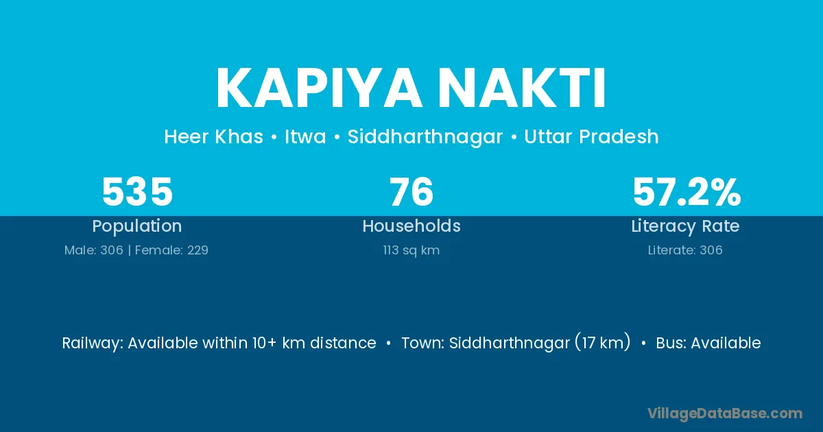 Siddharthnagar (17 km) is the nearest town to Kapiya Nakti village for major economic activities and is located approximately 17 km away.