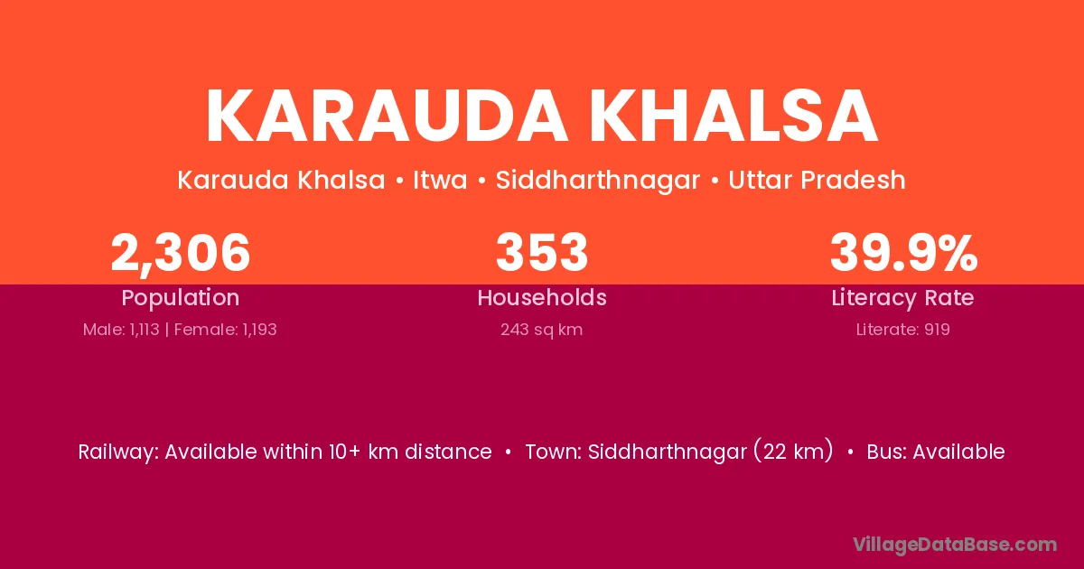 Siddharthnagar (22 km) is the nearest town to Karauda Khalsa village for major economic activities and is located approximately 22 km away.