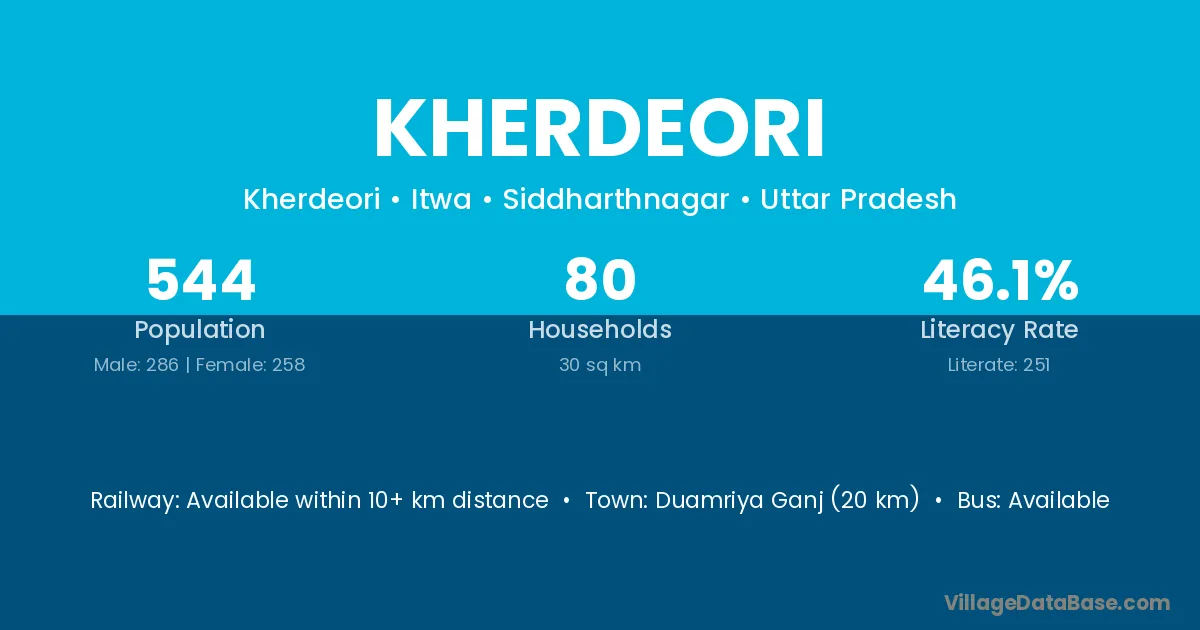 Duamriya Ganj (20 km) is the nearest town to Kherdeori village for major economic activities and is located approximately 20 km away.