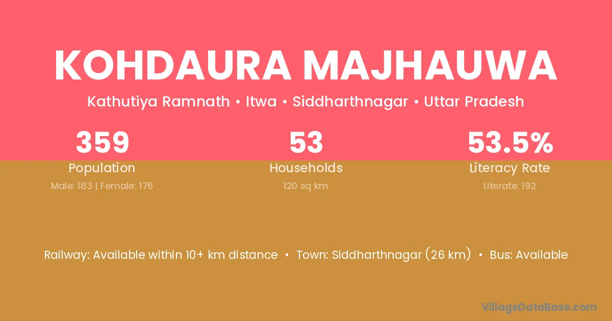 Siddharthnagar (26 km) is the nearest town to Kohdaura Majhauwa village for major economic activities and is located approximately 26 km away.