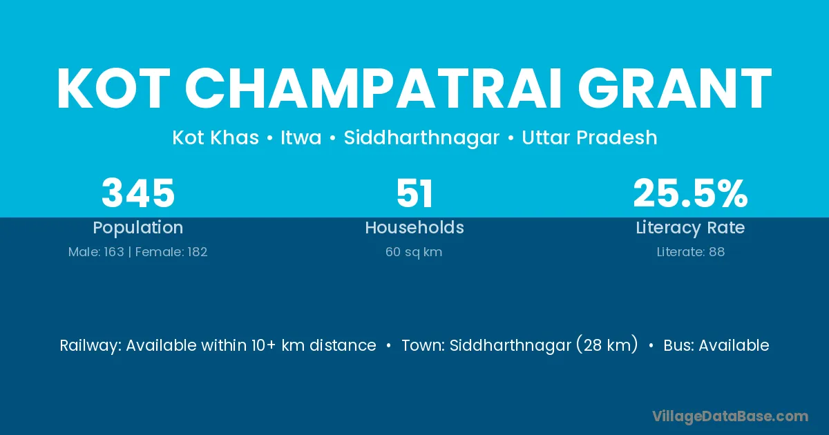 Siddharthnagar (28 km) is the nearest town to Kot Champatrai Grant village for major economic activities and is located approximately 28 km away.