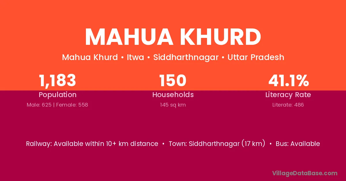 Siddharthnagar (17 km) is the nearest town to Mahua Khurd village for major economic activities and is located approximately 17 km away.