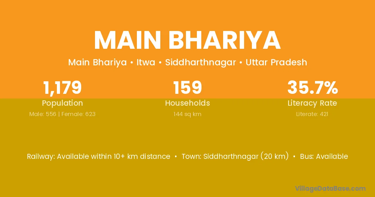 Siddharthnagar (20 km) is the nearest town to Main Bhariya village for major economic activities and is located approximately 20 km away.