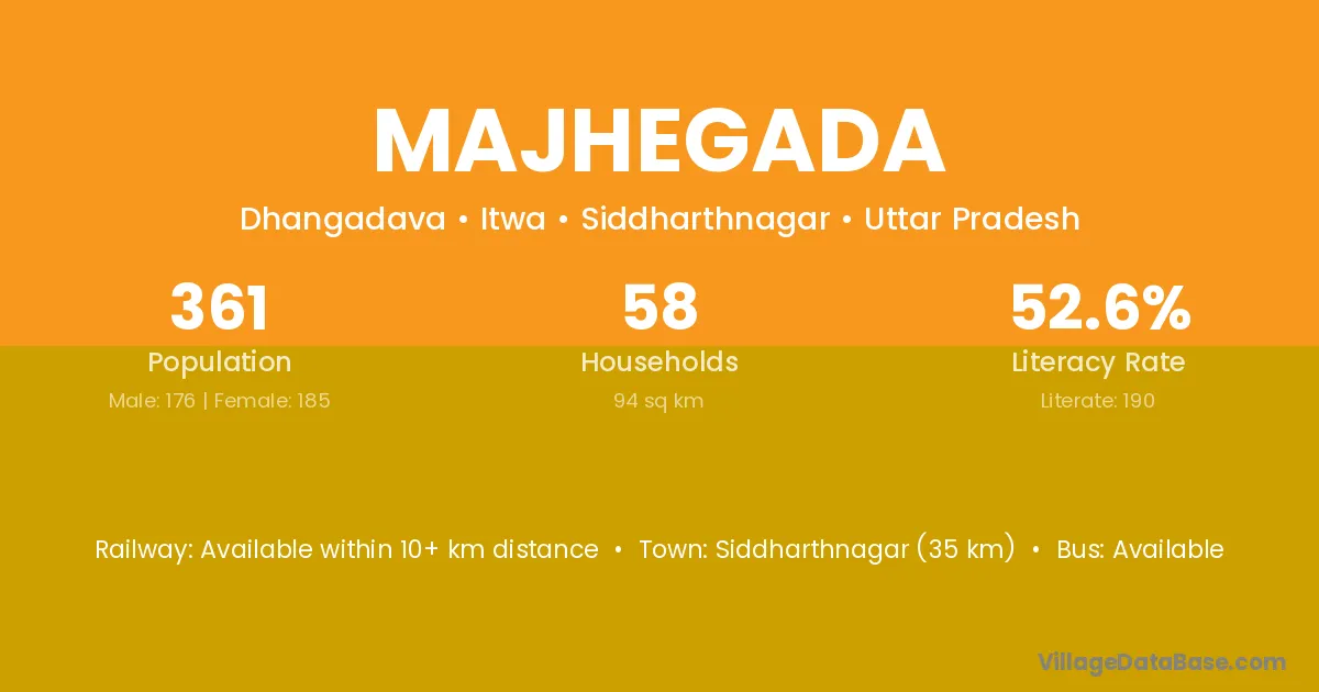 Siddharthnagar (35 km) is the nearest town to Majhegada village for major economic activities and is located approximately 35 km away.