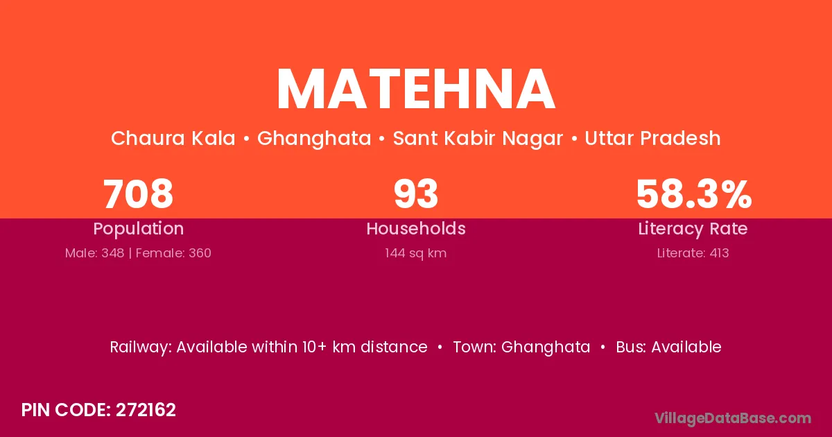 Siddharthnagar (26 km) is the nearest town to Matehna village for major economic activities and is located approximately 26 km away.