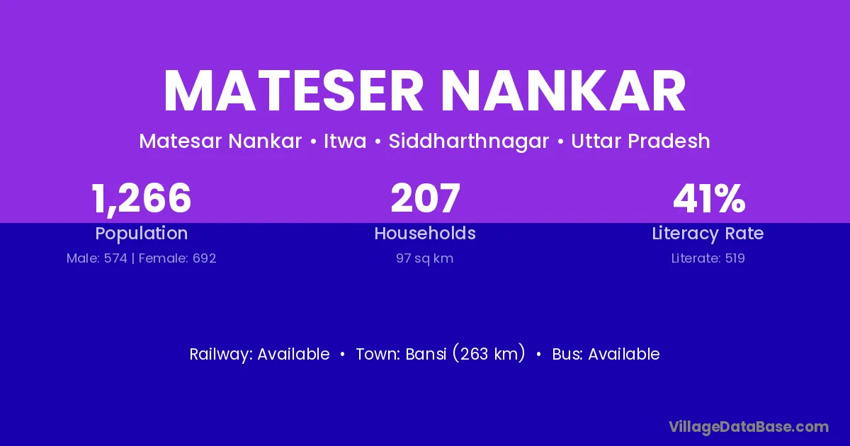 Bansi (263 km) is the nearest town to Mateser Nankar village for major economic activities and is located approximately 263 km away.