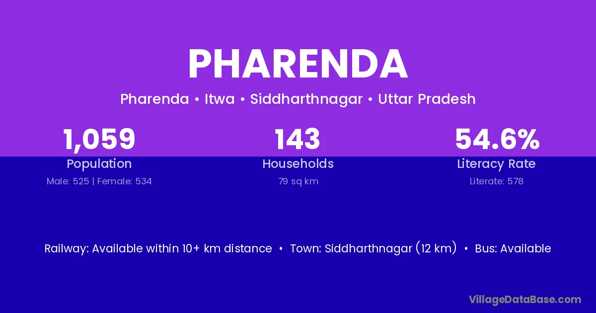 Siddharthnagar (12 km) is the nearest town to Pharenda village for major economic activities and is located approximately 12 km away.