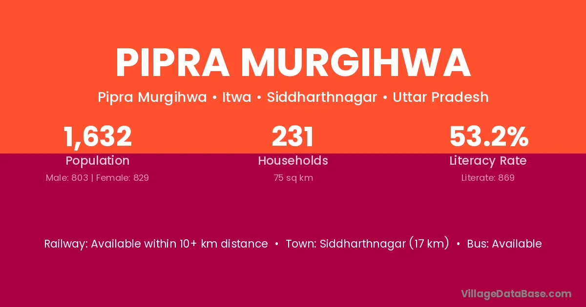 Siddharthnagar (17 km) is the nearest town to Pipra Murgihwa village for major economic activities and is located approximately 17 km away.