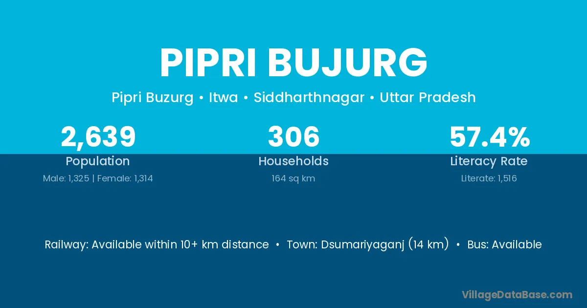 Dsumariyaganj (14 km) is the nearest town to Pipri Bujurg village for major economic activities and is located approximately 14 km away.