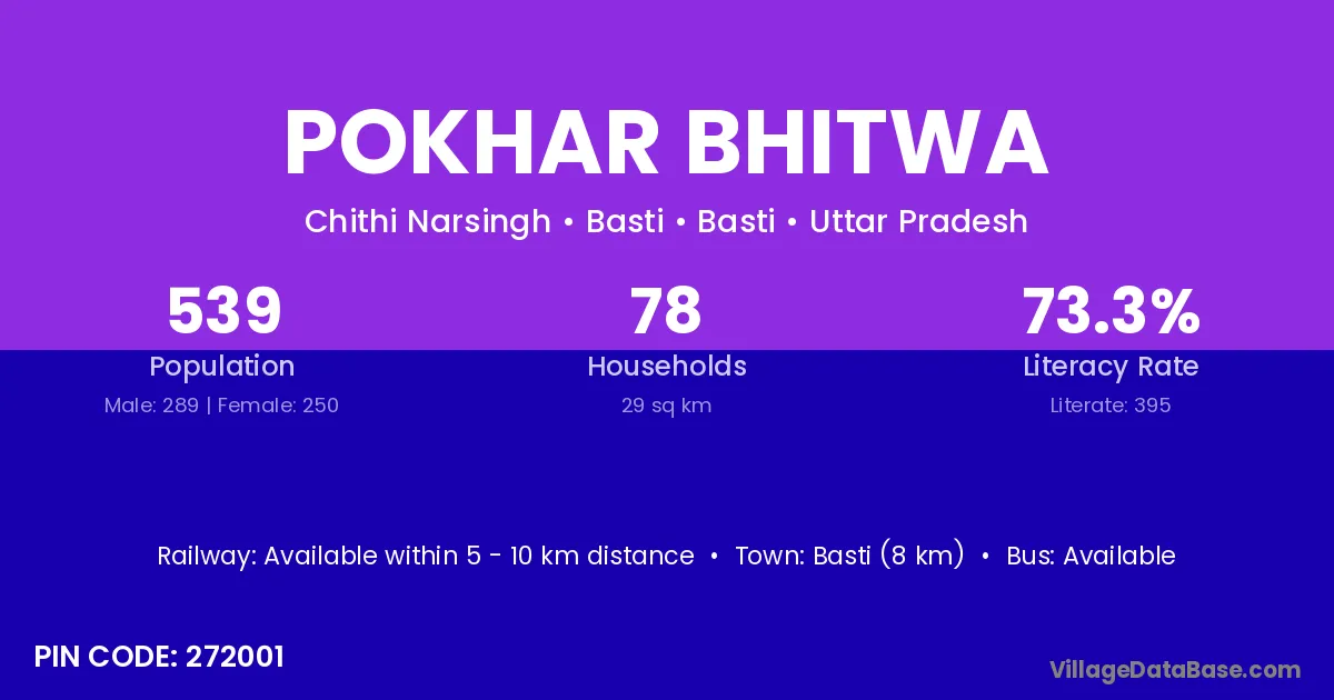 Siddharthnagar (68 km) is the nearest town to Pokhar Bhitwa village for major economic activities and is located approximately 68 km away.