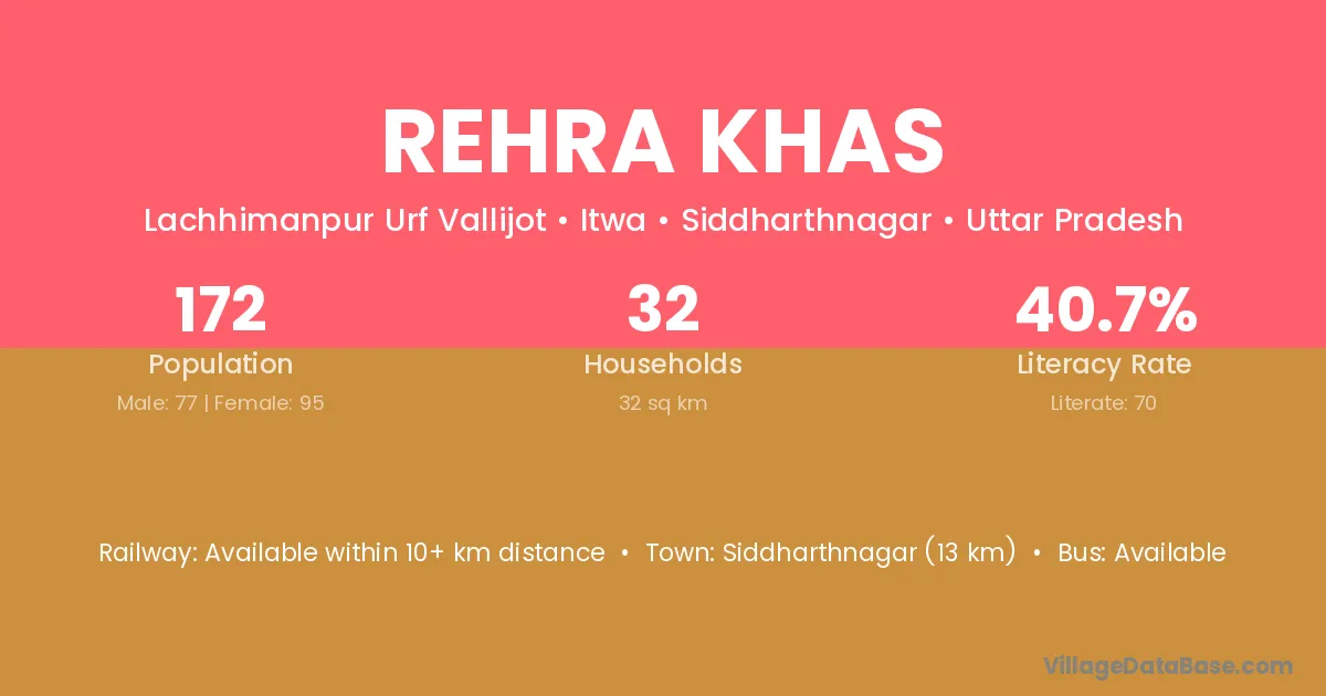 Siddharthnagar (13 km) is the nearest town to Rehra Khas village for major economic activities and is located approximately 13 km away.