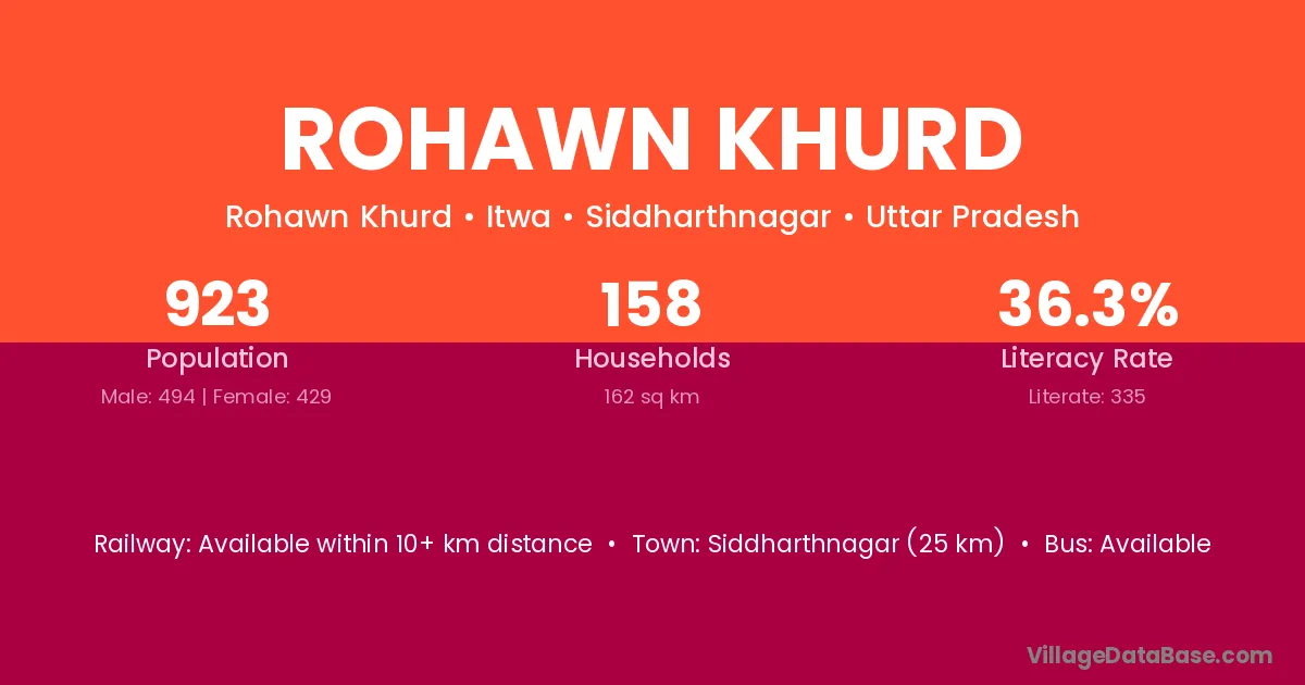 Siddharthnagar (25 km) is the nearest town to Rohawn Khurd village for major economic activities and is located approximately 25 km away.