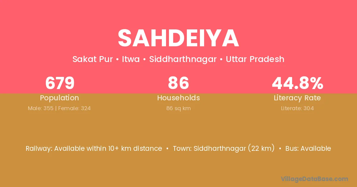 Siddharthnagar (22 km) is the nearest town to Sahdeiya village for major economic activities and is located approximately 22 km away.