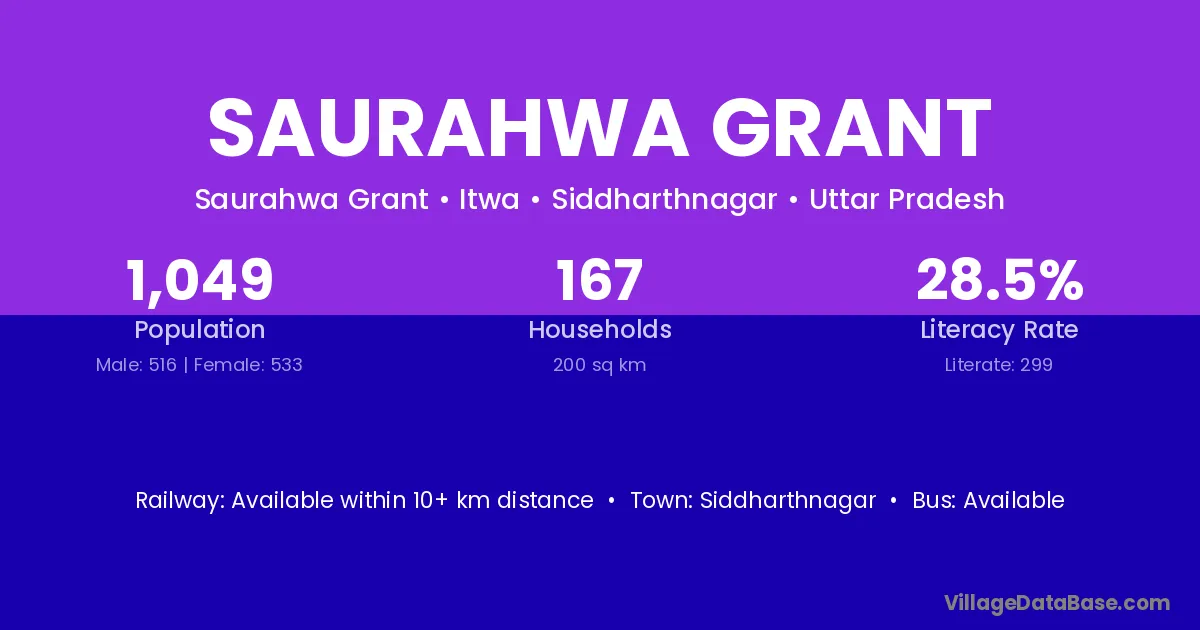 Saurahwa Grant village has a total population of 1,049 people, of which 516 are males and 533 are females.