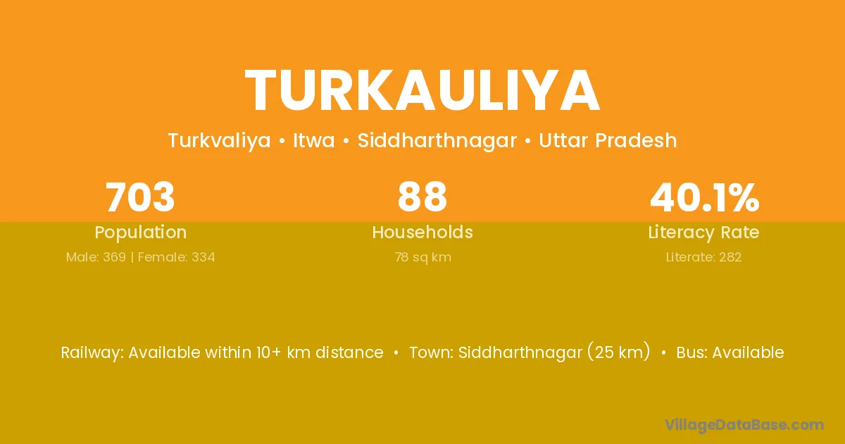 Siddharthnagar (25 km) is the nearest town to Turkauliya village for major economic activities and is located approximately 25 km away.