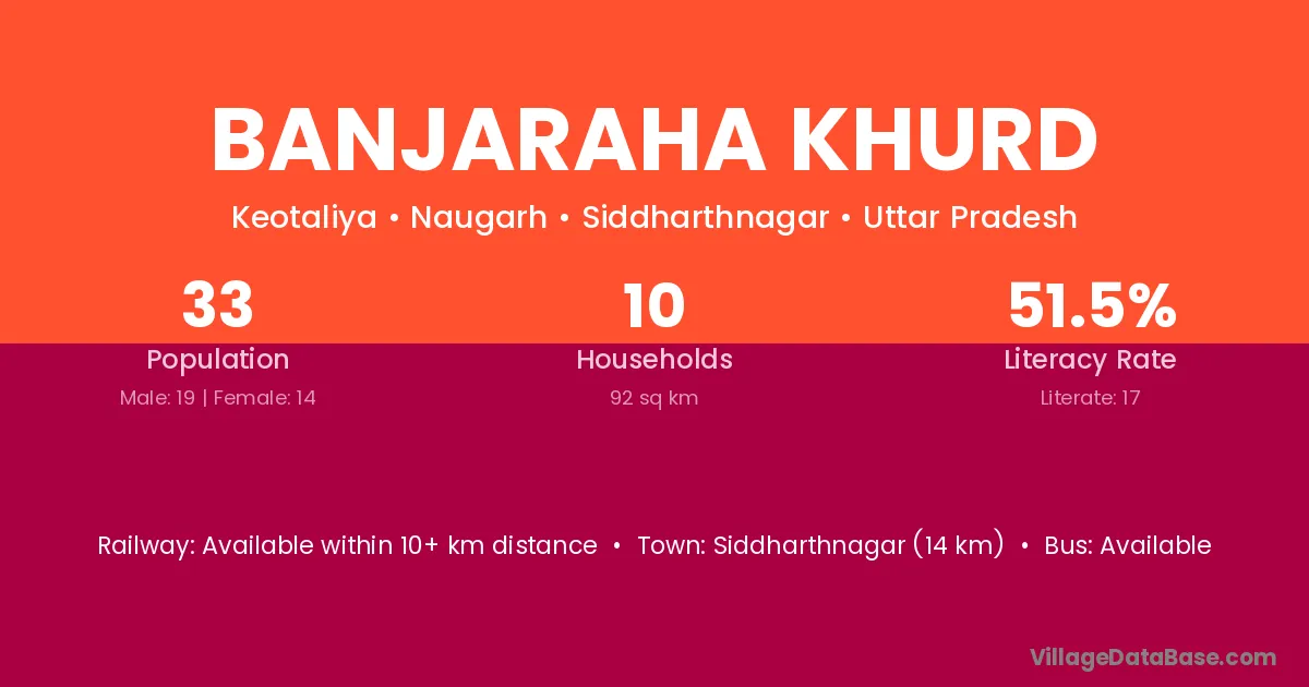 Siddharthnagar (14 km) is the nearest town to Banjaraha Khurd village for major economic activities and is located approximately 14 km away.