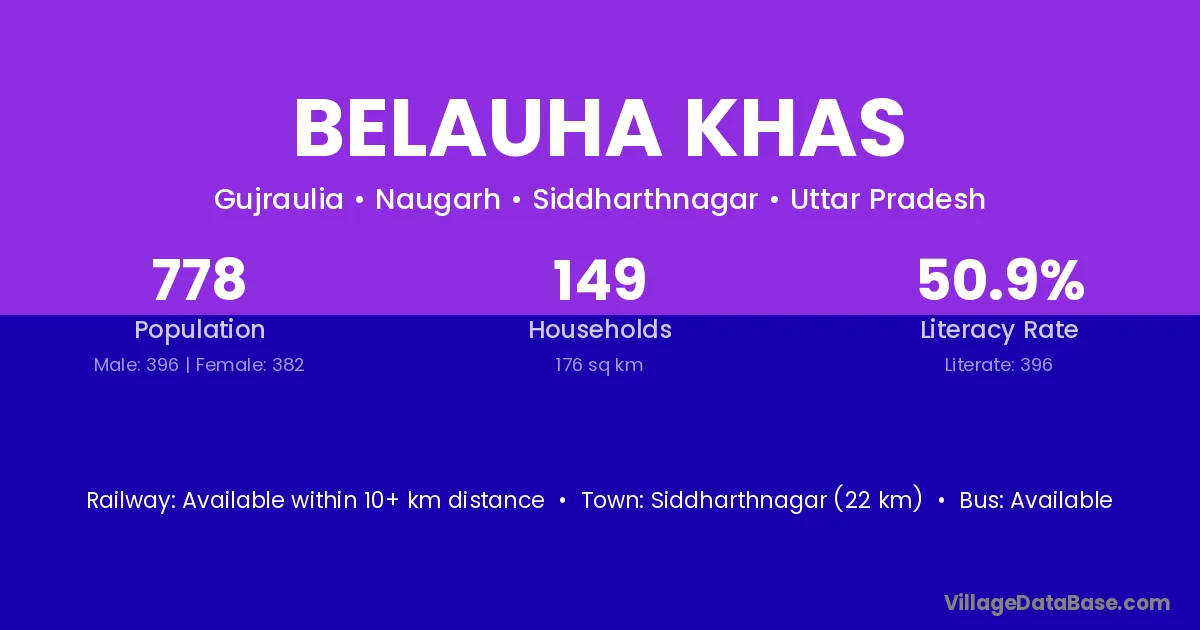 Siddharthnagar (22 km) is the nearest town to Belauha Khas village for major economic activities and is located approximately 22 km away.