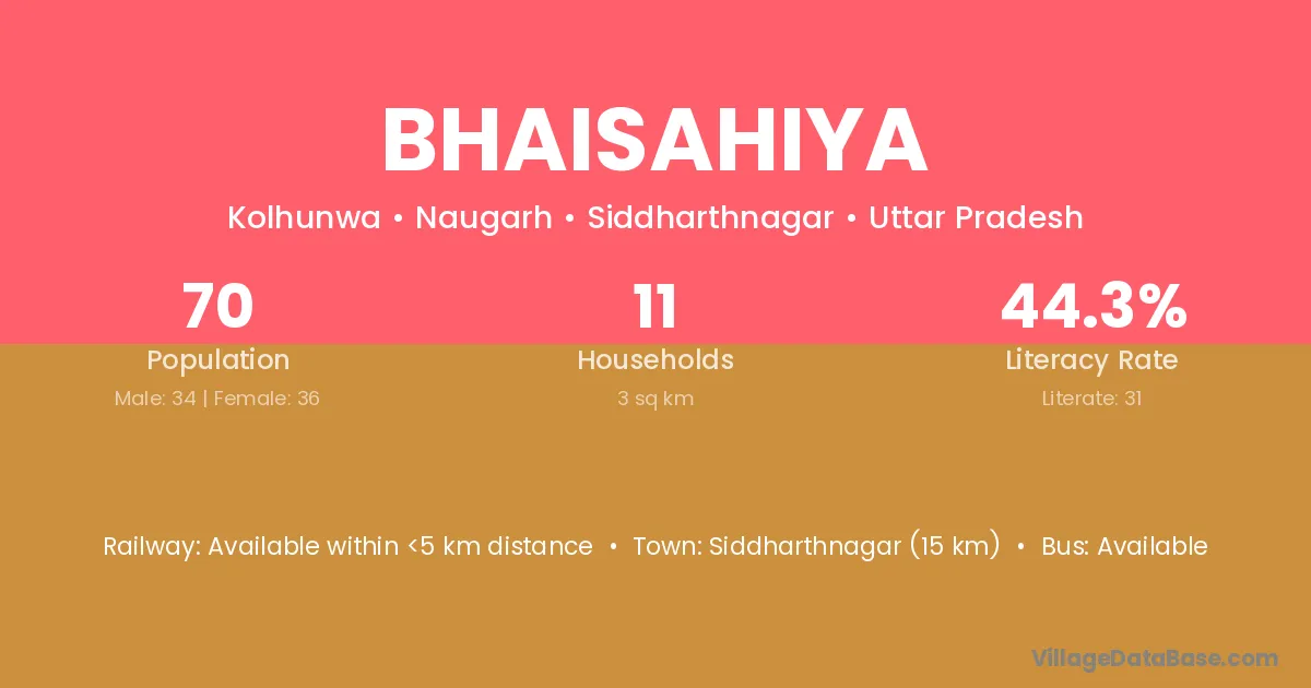 Siddharthnagar (15 km) is the nearest town to Bhaisahiya village for major economic activities and is located approximately 15 km away.