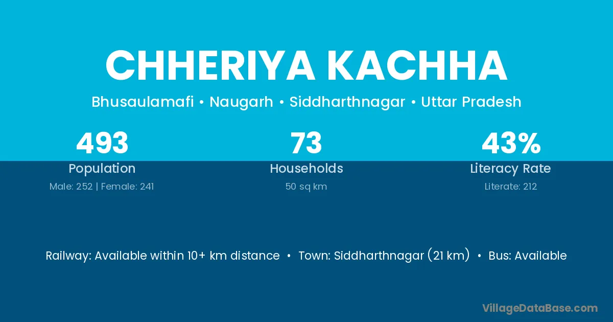 Siddharthnagar (21 km) is the nearest town to Chheriya Kachha village for major economic activities and is located approximately 21 km away.