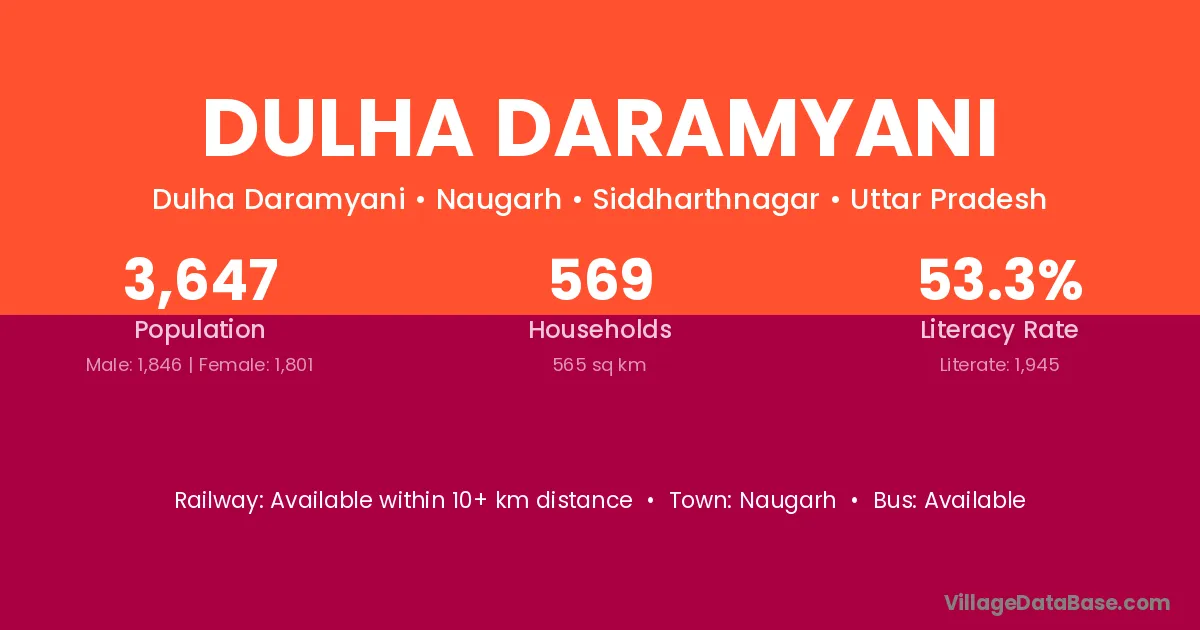 Dulha Daramyani village has a total population of 3,647 people, of which 1,846 are males and 1,801 are females.