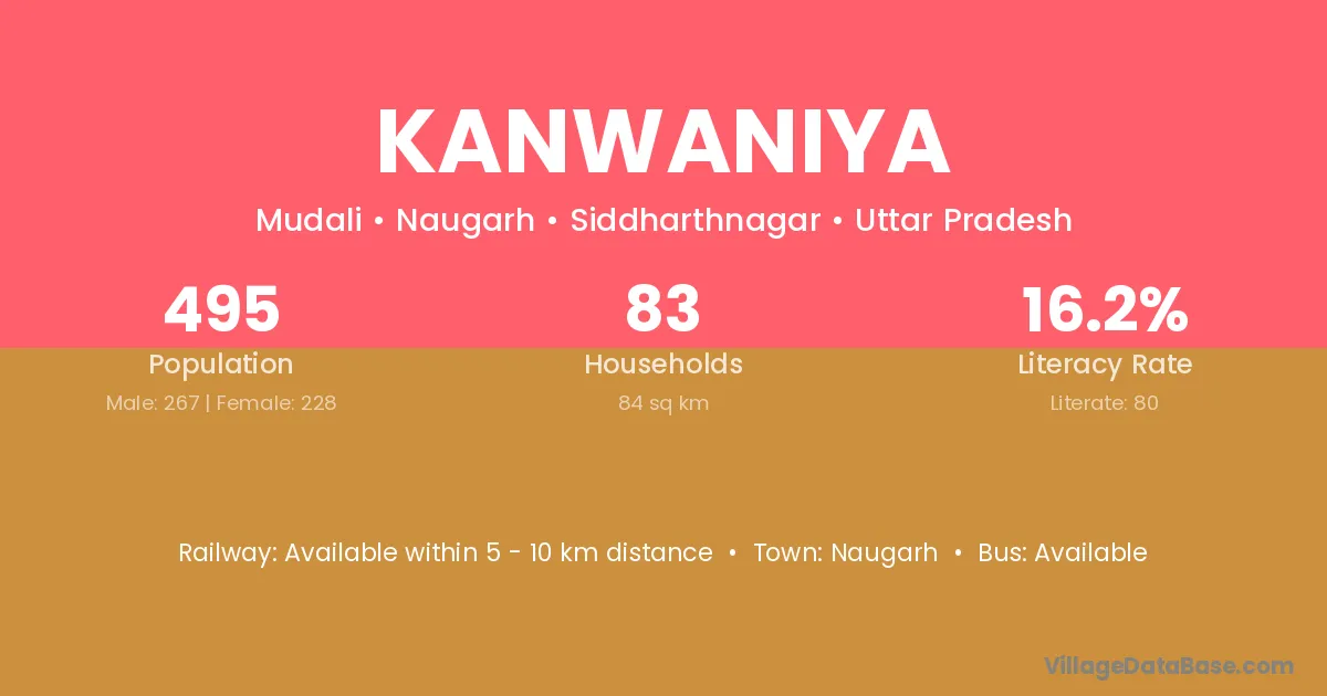 The literacy rate of Kanwaniya village is 16.16%. Male literacy stands at 26.22% and female literacy at 4.39%.