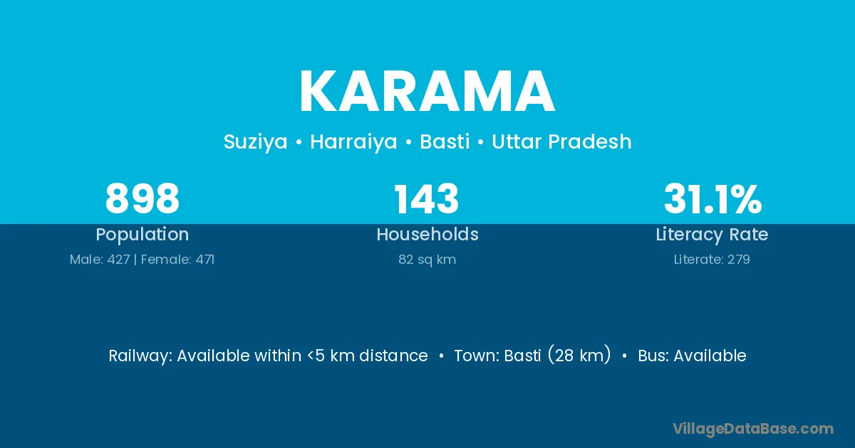 The literacy rate of Karama village is 47.05%. Male literacy stands at 63.33% and female literacy at 29.35%.
