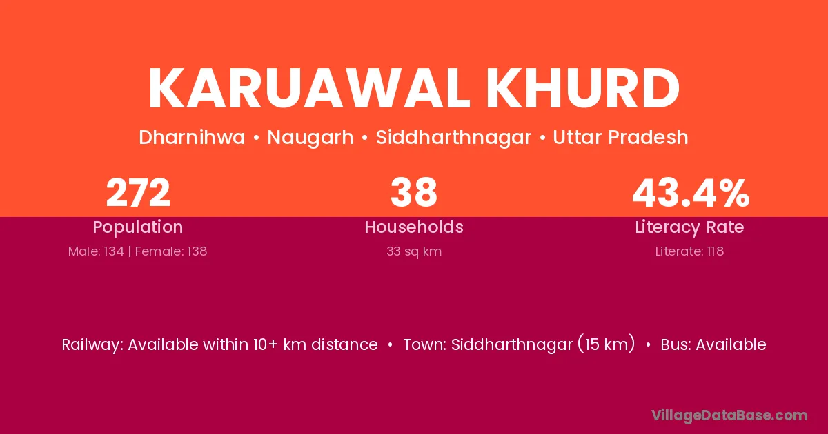 Siddharthnagar (15 km) is the nearest town to Karuawal Khurd village for major economic activities and is located approximately 15 km away.