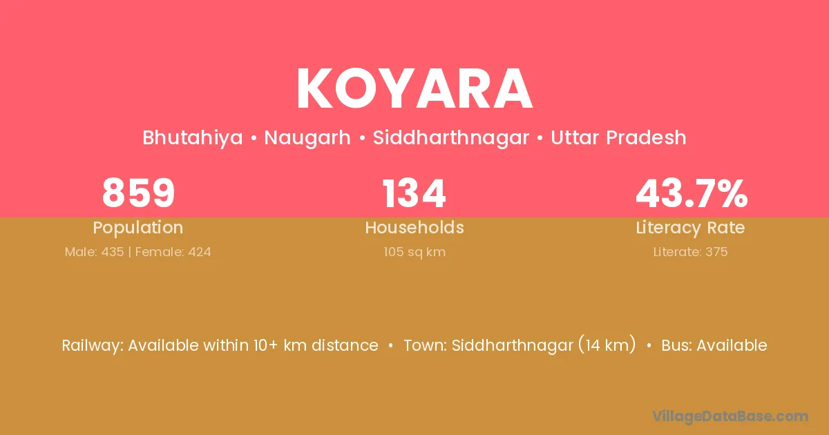 Siddharthnagar (14 km) is the nearest town to Koyara village for major economic activities and is located approximately 14 km away.