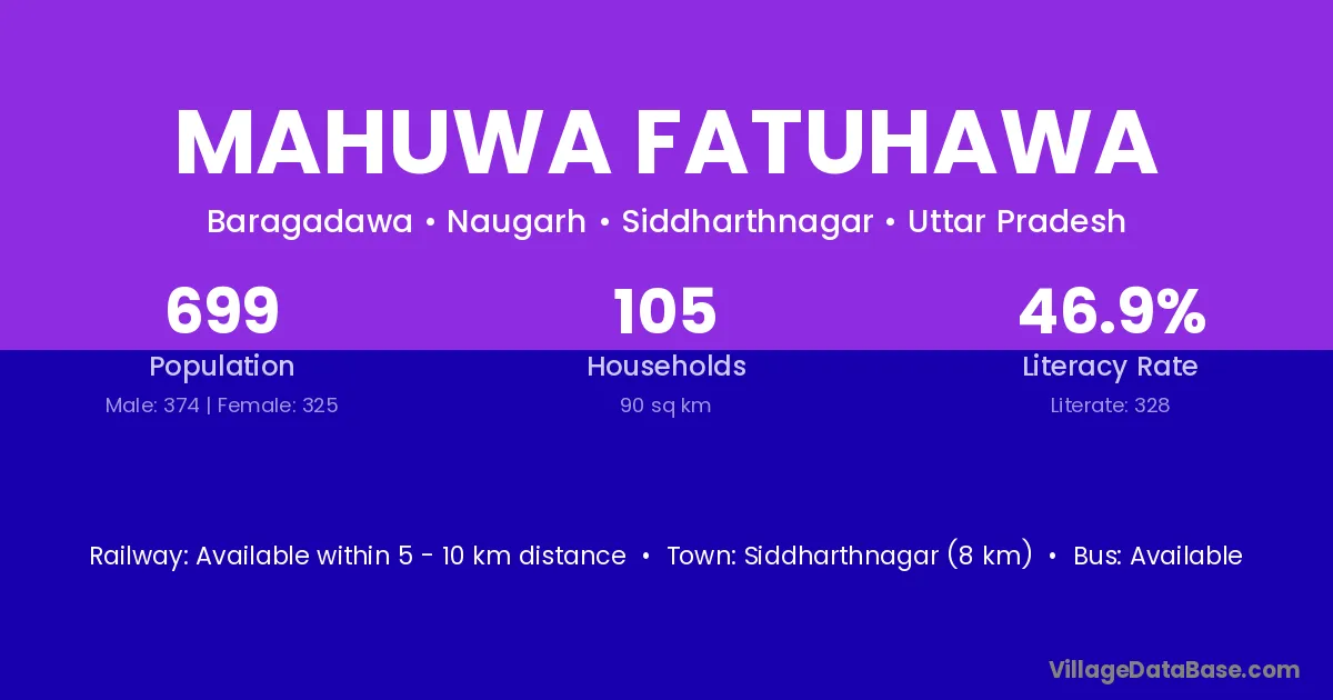 Siddharthnagar (8 km) is the nearest town to Mahuwa Fatuhawa village for major economic activities and is located approximately 8 km away.