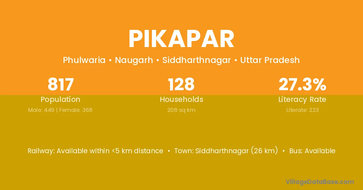 Siddharthnagar (26 km) is the nearest town to Pikapar village for major economic activities and is located approximately 26 km away.