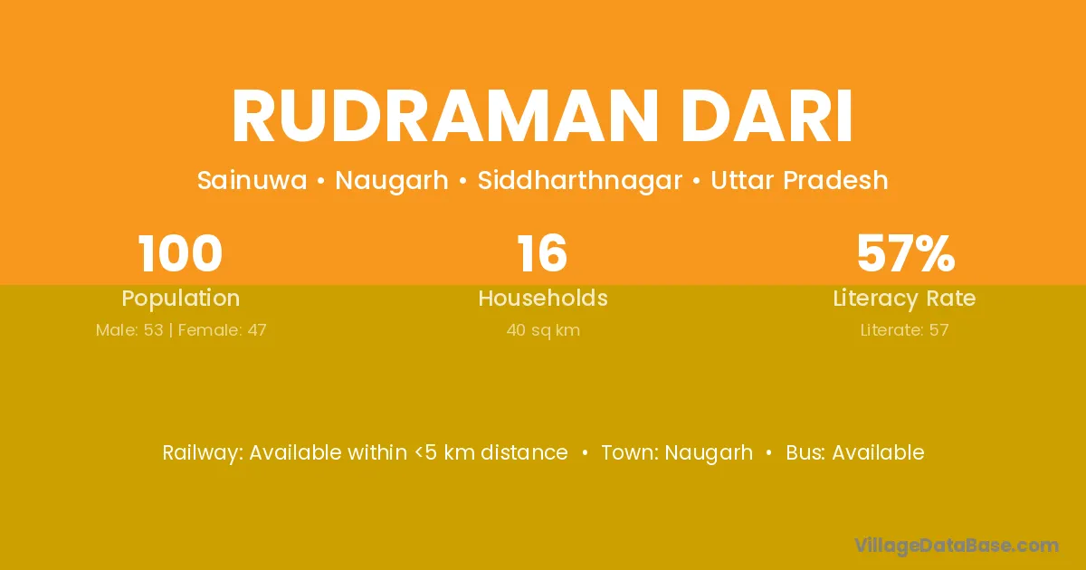 Rudraman Dari village has a total population of 100 people, of which 53 are males and 47 are females.