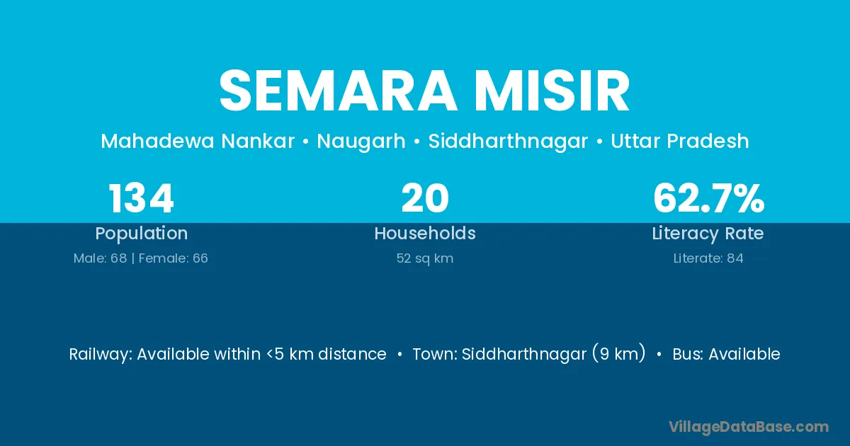 Siddharthnagar (9 km) is the nearest town to Semara Misir village for major economic activities and is located approximately 9 km away.