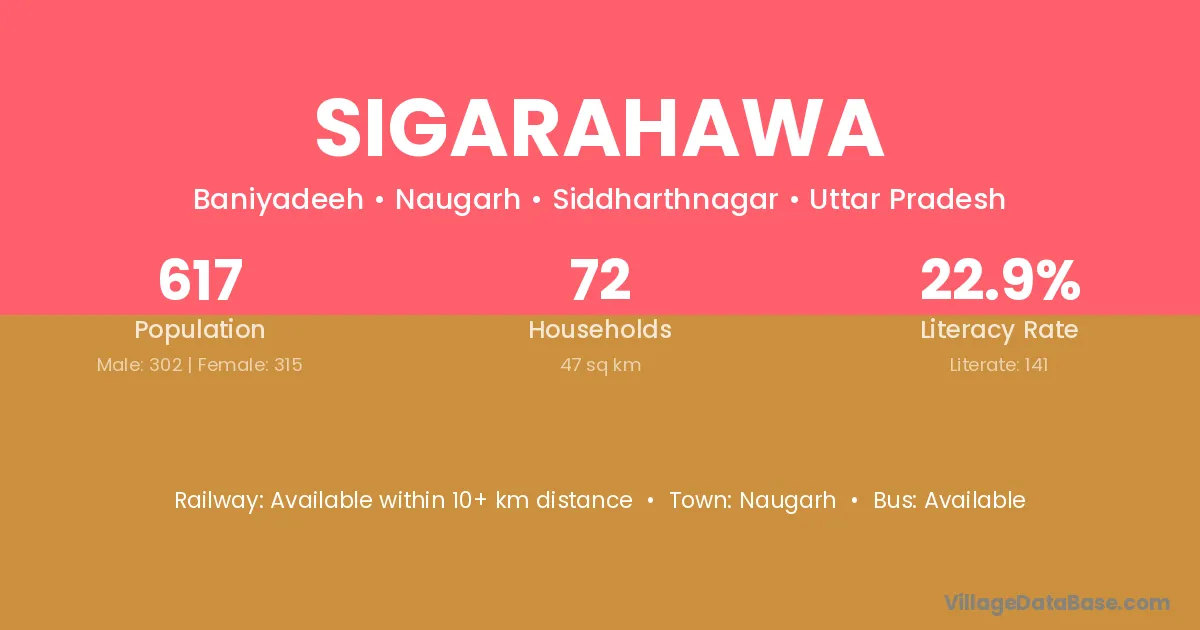 Sigarahawa village has a total population of 617 people, of which 302 are males and 315 are females.