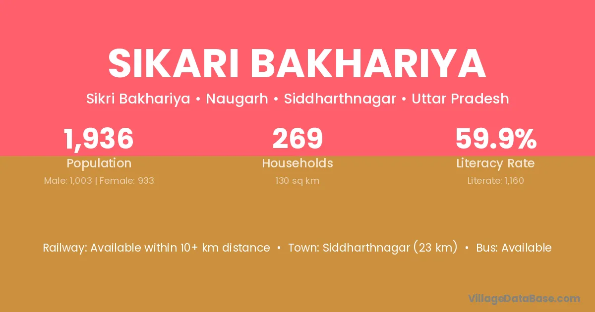 Siddharthnagar (23 km) is the nearest town to Sikari Bakhariya village for major economic activities and is located approximately 23 km away.