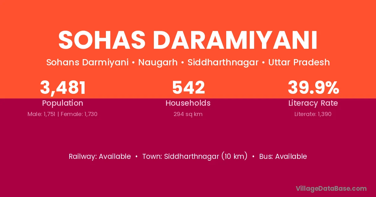 Siddharthnagar (10 km) is the nearest town to Sohas Daramiyani village for major economic activities and is located approximately 10 km away.