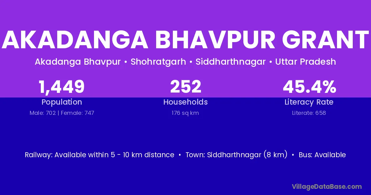 Siddharthnagar (8 km) is the nearest town to Akadanga Bhavpur Grant village for major economic activities and is located approximately 8 km away.