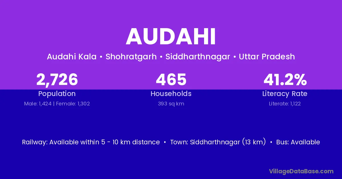 Siddharthnagar (13 km) is the nearest town to Audahi village for major economic activities and is located approximately 13 km away.