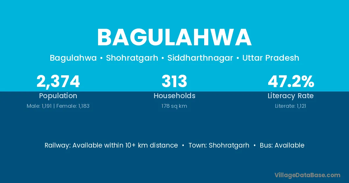 Bagulahwa village has a total population of 2,374 people, of which 1,191 are males and 1,183 are females.