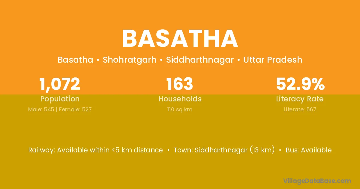 Siddharthnagar (13 km) is the nearest town to Basatha village for major economic activities and is located approximately 13 km away.