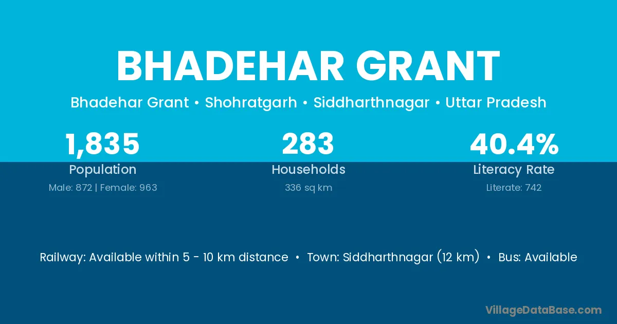 Siddharthnagar (12 km) is the nearest town to Bhadehar Grant village for major economic activities and is located approximately 12 km away.