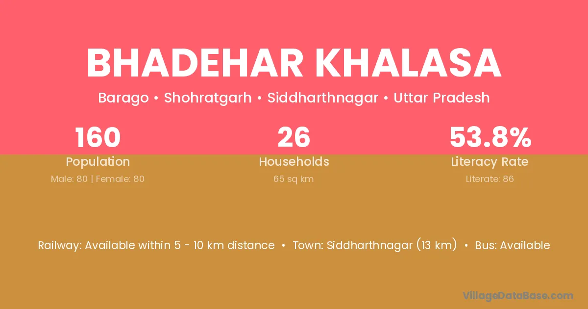 Siddharthnagar (13 km) is the nearest town to Bhadehar Khalasa village for major economic activities and is located approximately 13 km away.