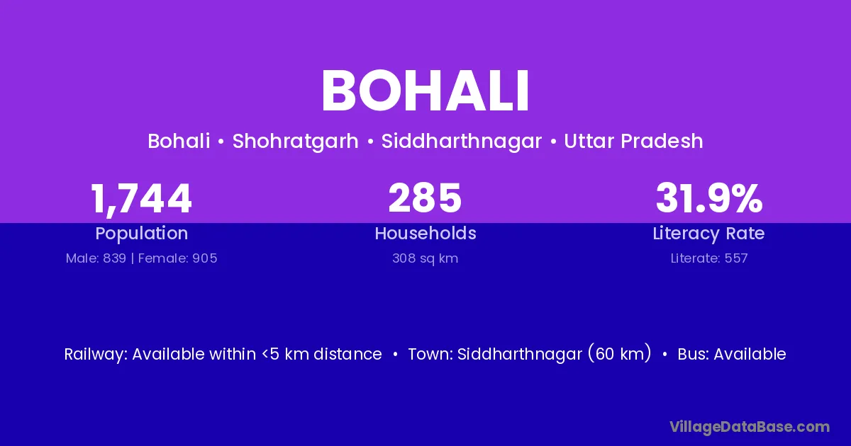 Siddharthnagar (60 km) is the nearest town to Bohali village for major economic activities and is located approximately 60 km away.