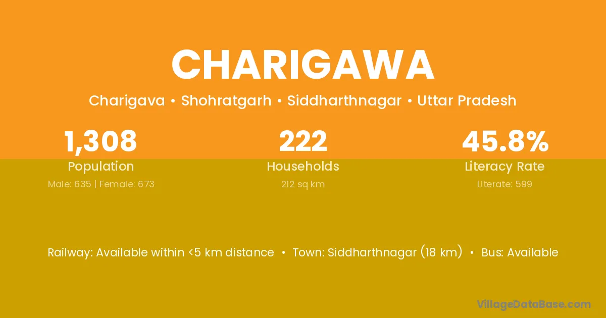 Siddharthnagar (18 km) is the nearest town to Charigawa village for major economic activities and is located approximately 18 km away.