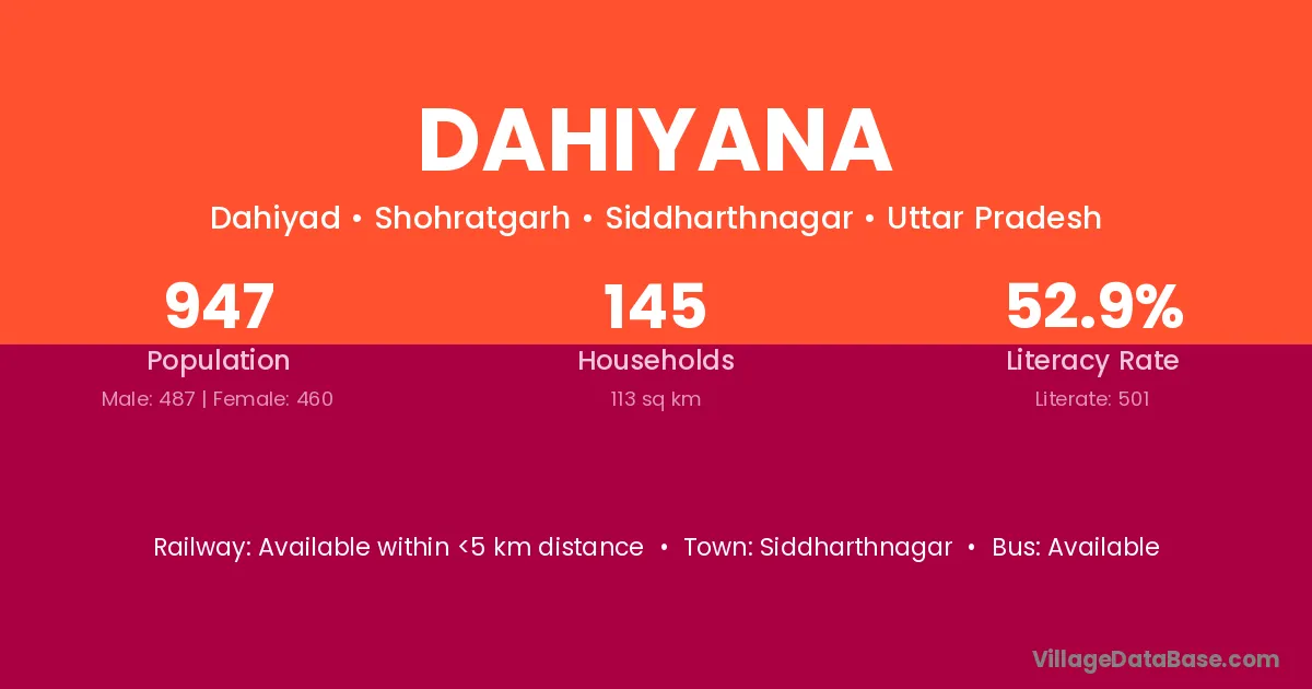 Dahiyana village has a total population of 947 people, of which 487 are males and 460 are females.