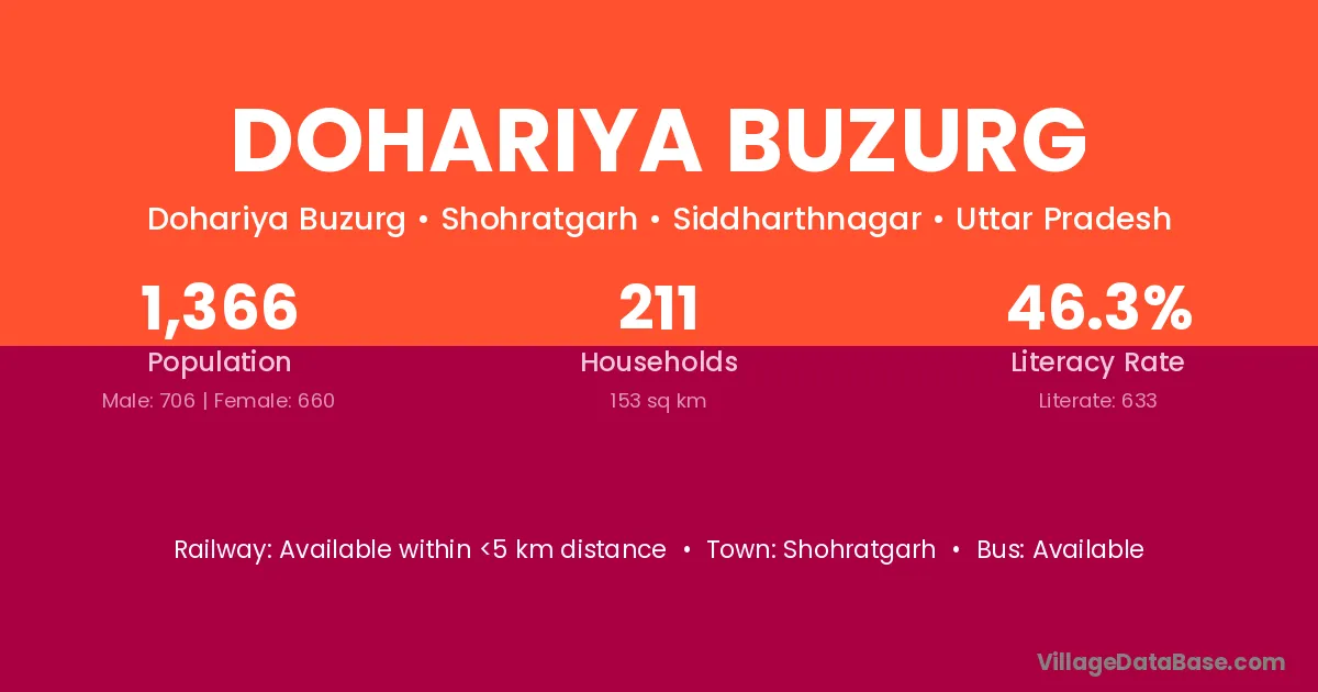 Dohariya Buzurg village has a total population of 1,366 people, of which 706 are males and 660 are females.