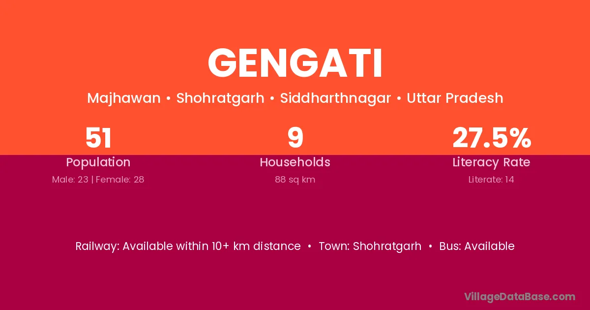 Gengati village has a total population of 51 people, of which 23 are males and 28 are females.