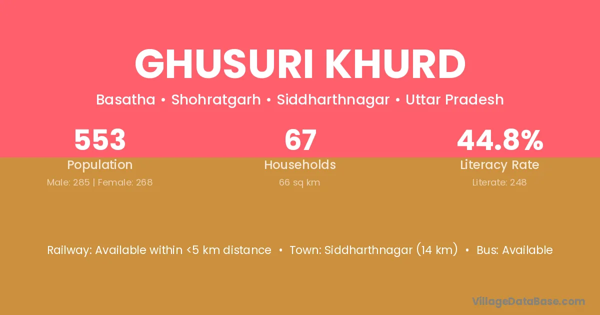 Siddharthnagar (14 km) is the nearest town to Ghusuri Khurd village for major economic activities and is located approximately 14 km away.