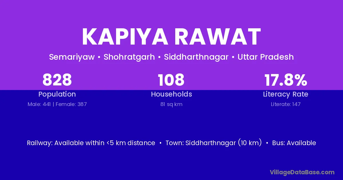 Siddharthnagar (10 km) is the nearest town to Kapiya Rawat village for major economic activities and is located approximately 10 km away.